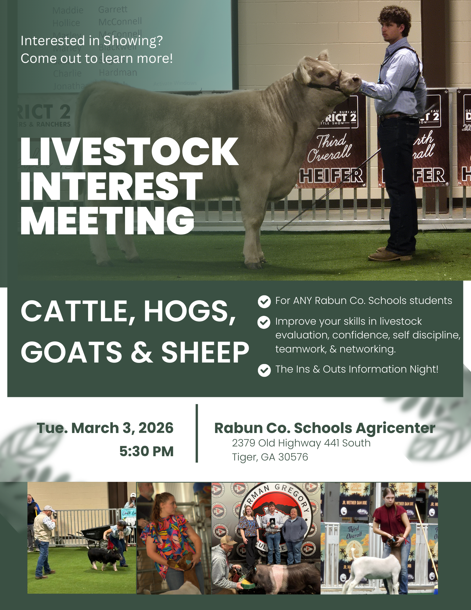 Interested in showing livestock? Come to the Rabun Co. Agricenter on Tuesday, March 3rd, at 5:30 PM for our interest meeting! See you there!