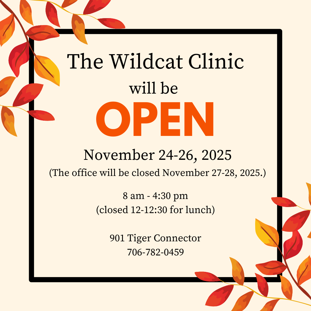 The Wildcat Clinic will be open during normal hours on Monday through Wednesday this week, operating from 8:00 a.m. to 4:30 p.m., with a lunch break from 12:00 to 12:30 p.m. The clinic will be clos...