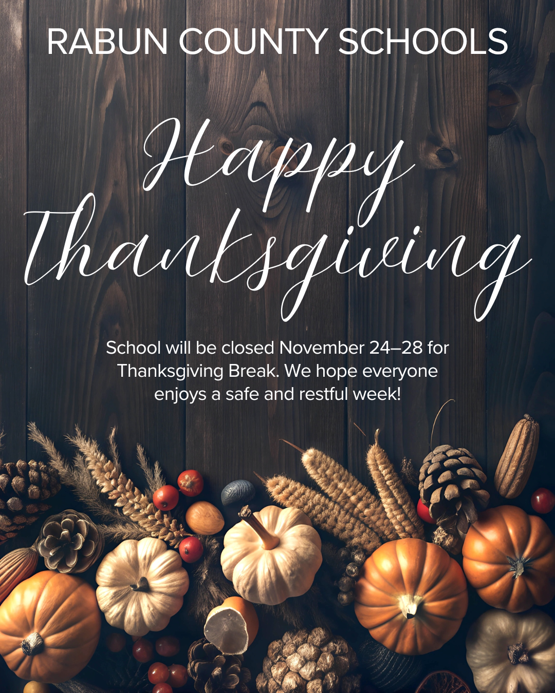 Rabun County Schools will be closed November 24-28 for Thanksgiving Break. We hope everyone enjoys a safe and restful week!