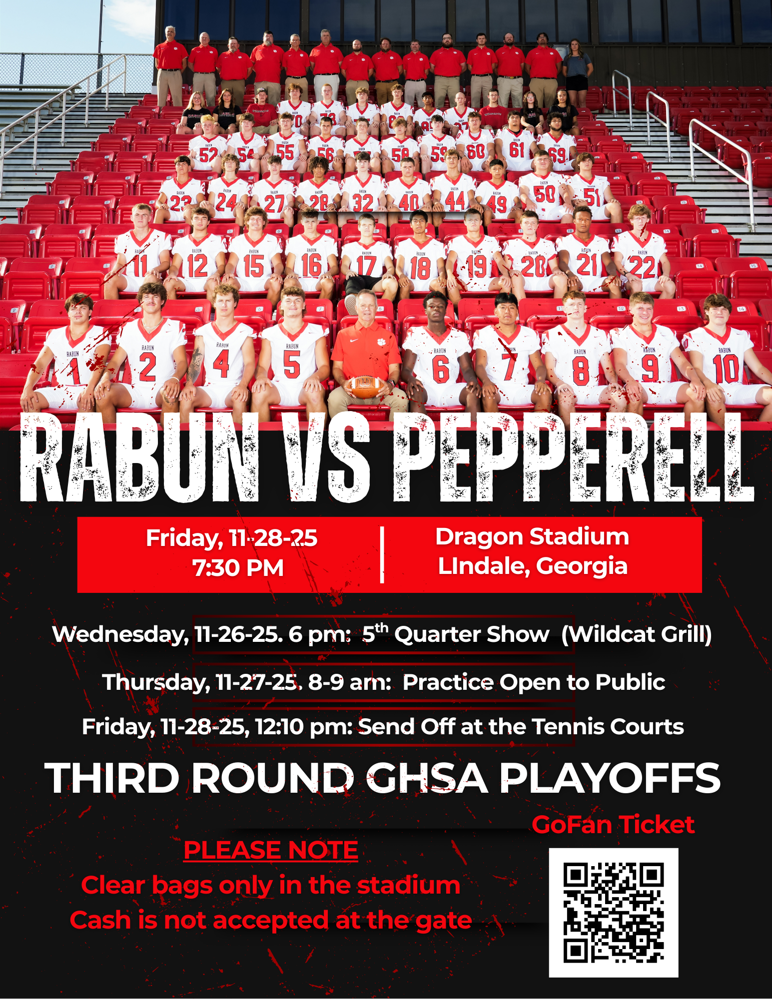 Our Wildcats take on Pepperell this Friday at 7:30 PM at Dragon Stadium in the 3rd Round of GHSA Playoffs!📍 Location:Pepperell High School, Lindale, Georgia🎟 Tickets:All tickets must be purchased ...